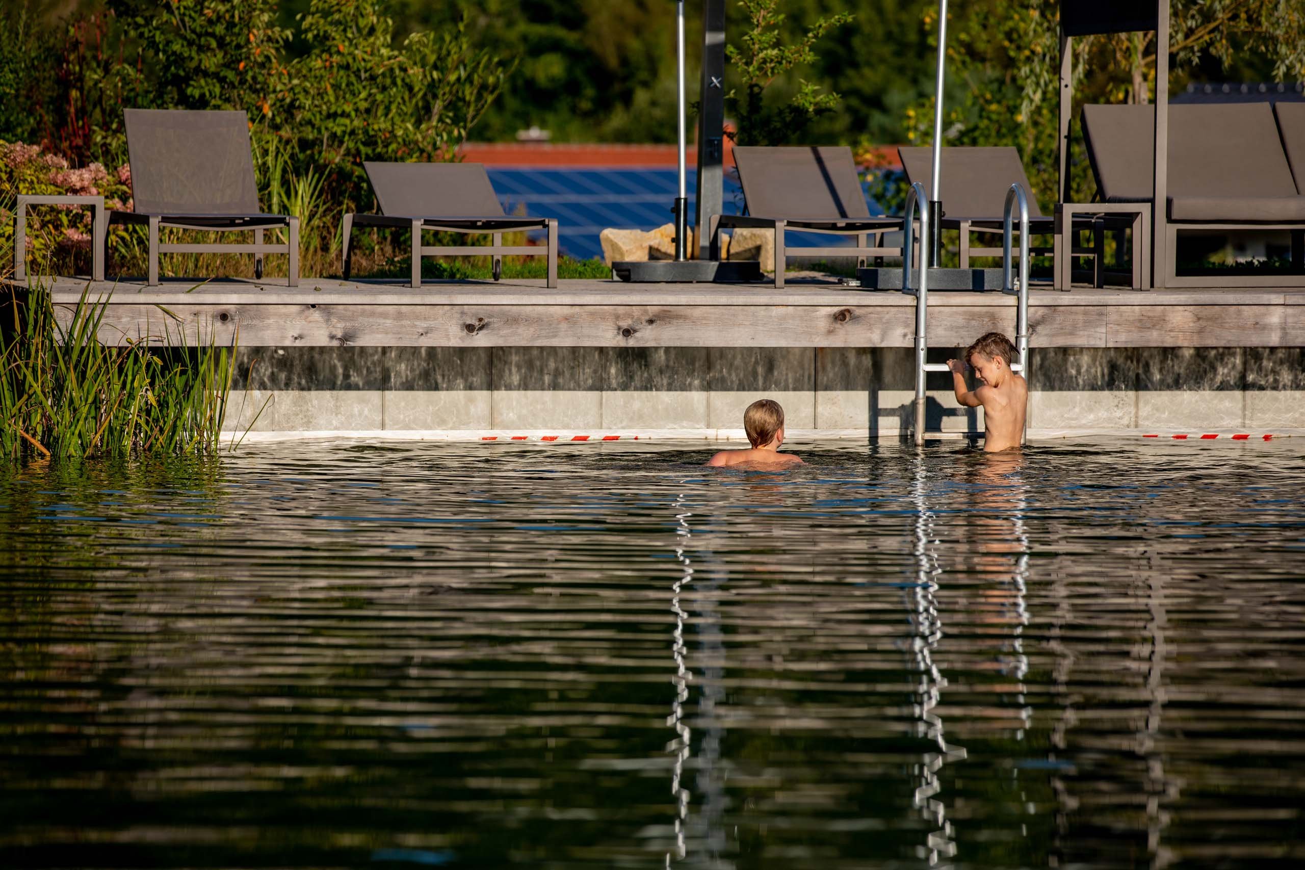 Durch eine Glastür geht es hier in eine moderne Wohlfühl-Oase. Die Badewanne bietet einen Rundum-Panoramablick in die Natur. Das Badezimmer ist außerdem mit einem Doppelwaschbecken, Dusche und einer weiteren, räumlich abgetrennten Toilette ausgestattet und verfügt über ein Internet-Radio. Hier befindet sich auch die Infrarot-/Saunakabine für private Spa-Momente. Alle Suiten sind mit einem großen Balkon bzw. Terrasse ausgestattet auf der sich ein Whirlpool und die Relax-Liegen befinden. Ein gut gefüllter Wein-Klimaschrank steht Ihnen in der Suite zur Verfügung (für Sie inklusive).
